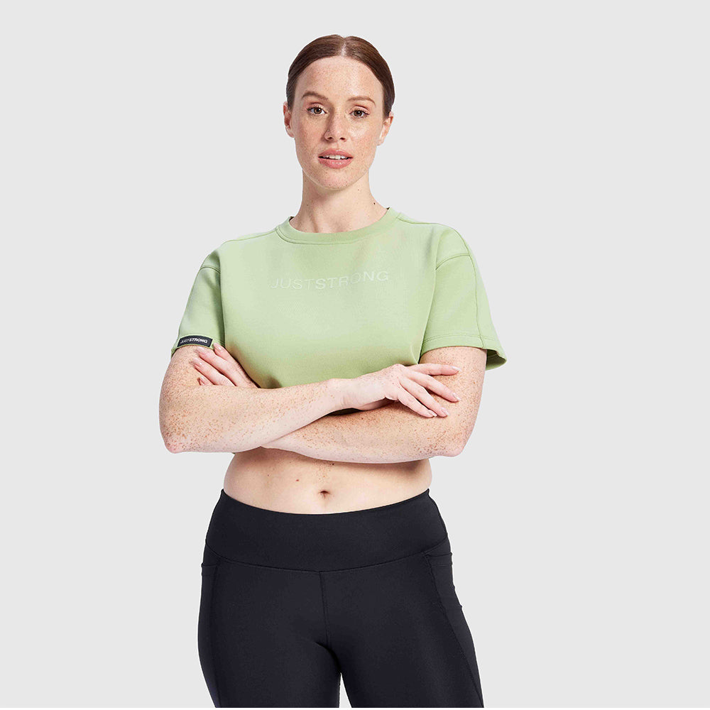Our Lime Green Oversized Athletic Cropped Tonal T-Shirt is made from a super breathable fabric that feels luxurious to the skin. It features a JustStrong detail badge on the arm and a tonal print to the center chest for a minimalistic, quality design. Perfect for any sort of workout, this T-shirt is sure to keep you comfortable and stylish.